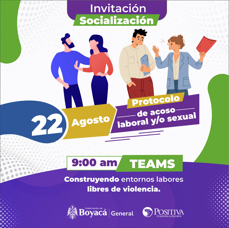 Publicado el Miércoles, 21 Agosto 2024 La meta es construir entornos labores libres de violencias. La Dirección General de Talento Humano de la Secretaría General de la Gobernación de Boyacá invita a funcionarios y contratistas a la socialización del Protocolo de Acoso Laboral y/o Sexual que se llevará a cabo este jueves 22 de agosto, a las 9:00 a.m., a través de la plataforma Team por el siguiente enlace: https://acortar.link/K7d4cv Durante este espacio, la psicóloga Alejandra Higuera, de la Dirección de Talento Humano, explica la importancia y los detalles del protocolo establecido conforme a la Ley 1010 de 2006, que guía la prevención y manejo de conductas de acoso. “Se abordarán los mecanismos y procedimientos para la denuncia, así como la identificación de posibles conductas de acoso laboral y sexual”, aseguró Higuera. El objetivo principal de esta socialización es promover el conocimiento del protocolo entre todas y todos los funcionarios y contratistas, facilitando la comprensión de las diferentes modalidades de acoso y los pasos necesarios para reportar incidentes al Comité de Convivencia Laboral. Además, se lanzará una estrategia digital accesible, a través de la intranet, diseñada para asegurar que todos los empleados puedan acceder fácilmente a la información y herramientas pertinentes. Se invita a todos los participantes a conectarse puntualmente para familiarizarse con estos importantes recursos y procedimientos, asegurando así un entorno laboral seguro y respetuoso para todos. Visitantes: 3